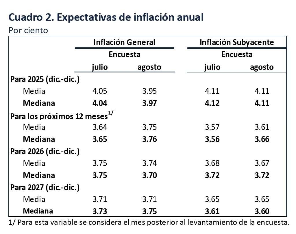 En cuanto a la inflación subyacente, las medianas correspondientes se sitúan en 4.1% para el cierre de 2025 y en 3.6% para los cierres de 2026 y 2027.