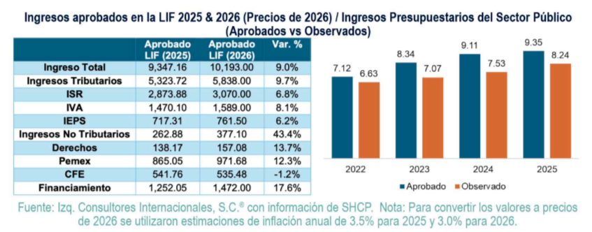 Con este conjunto de medidas, el Gobierno espera que los ingresos tributarios alcancen 5.83 billones de pesos en 2026, lo que representa un incremento del 9.7% respecto a lo aprobado para 2025. La recaudación por ISR se estima en 3.07 billones de pesos (+6.8%), mientras que por IVA se proyectan 1.59 billones (+8.1%). Si bien el fortalecimiento de la fiscalización puede mejorar la recaudación en el corto plazo, su efecto podría recaer principalmente en los contribuyentes cumplidos, dado que no se trata de una verdadera reforma fiscal estructural.