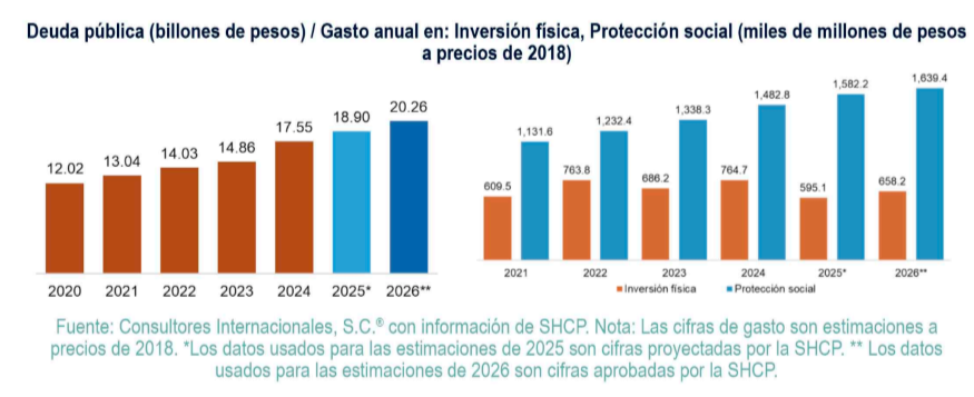 Lo anterior ya se puede advertir, para 2026, el presupuesto federal ascenderá a 10.19 billones de pesos, de los cuales 1.47 billones provendrán de endeudamiento nuevo lo que incrementa el costo de la deuda a 1.6 billones lo que implica un aumento de 9.4% real siendo el segundo rubro específico de gasto en el PEF. En un entorno donde la inversión productiva disminuye y el gasto corriente incluido el costo financiero- crece aceleradamente, la deuda deja de ser un instrumento de desarrollo y se convierte en un recurso para sostener compromisos presentes sin construir capacidad económica futura. Esta dinámica subraya la urgencia de reorientar el uso de la deuda hacia proyectos verdaderamente productivos que impulsen la economía, generen ingresos y fortalezcan la sostenibilidad fiscal de largo plazo.
