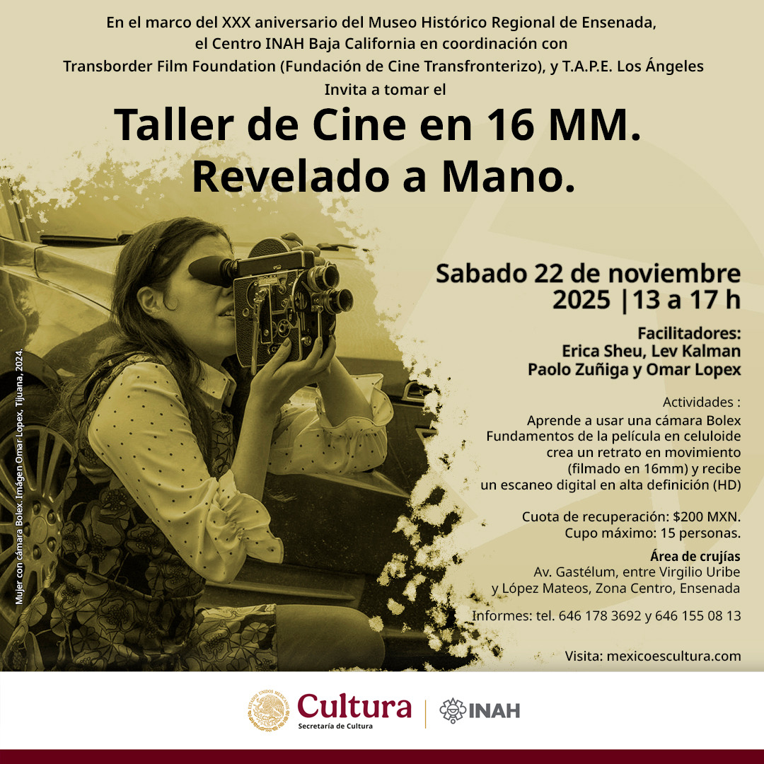 En el marco del XXX aniversario del Museo Histórico Regional de Ensenada, el Centro INAH Baja California en coordinación con Transborder Film Foundation (Fundación de Cine Transfronterizo), y T.A.P.E. Los Ángeles, realizará un taller de cine en 16 MM, revelado a Mano.