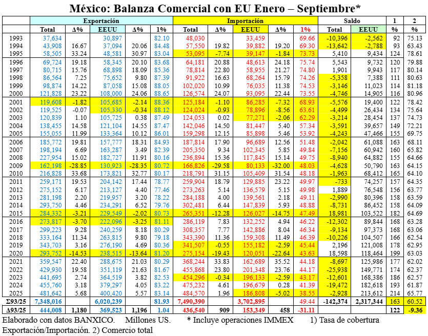 Durante los primeros 9 meses de 2025, la Exportación Total de México registró un incremento de 5.68% en relación con 2024, alcanzando una cifra de 481,642 millones US, lo que representó un crecimiento de 1,180% en el periodo 1993/2025, un incremento de 444,008 millones US y un acumulado de 7,348,016 millones US.