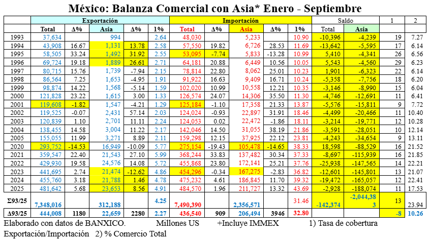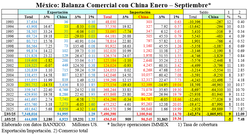 En este contexto, el porcentaje de la importación procedente de China pasó de 0.65% en 1993, a 19.99% en 2025.