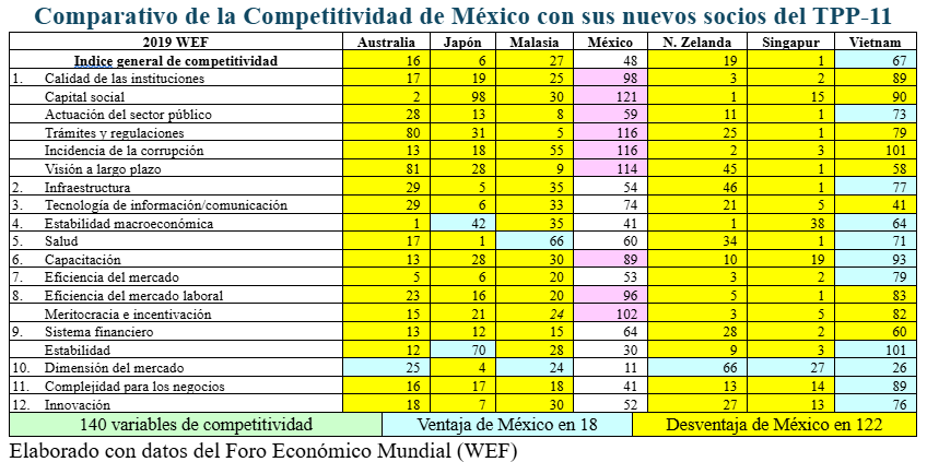 Peor todavía fue con la firma del TPP-11 pues, si durante el periodo de 25 años antes de su firma, México había acumulado un déficit de -131,036 millones US con los que serían sus 6 nuevos socios, en los primeros 7 años de operación, el déficit para nuestro país fue muy superior: -147,045 millones US pues, nuestro nivel de competitividad era pésimo y sigue siéndolo ya que, de las 140 variables que lo miden, nuestra desventaja se presenta en 122, con especial incidencia en la pésima calidad de las instituciones y sus funcionarios, incapaces de diseñar una estrategia, con programas, proyectos y políticas públicas realistas.