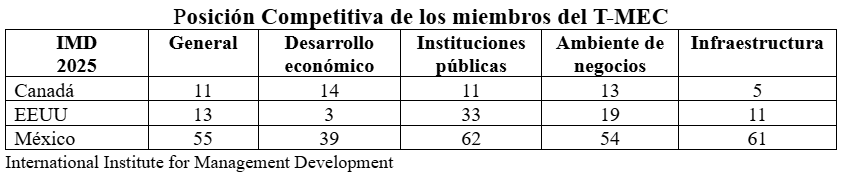 Conviene señalar que el IMD, recientemente publicó su análisis sobre competitividad de las 65 principales economías del mundo, situando a México en la 55ª posición, muy lejana de sus socios comerciales del T-MEC, saliendo pésimamente clasificado en las cuatro variables que se analizan